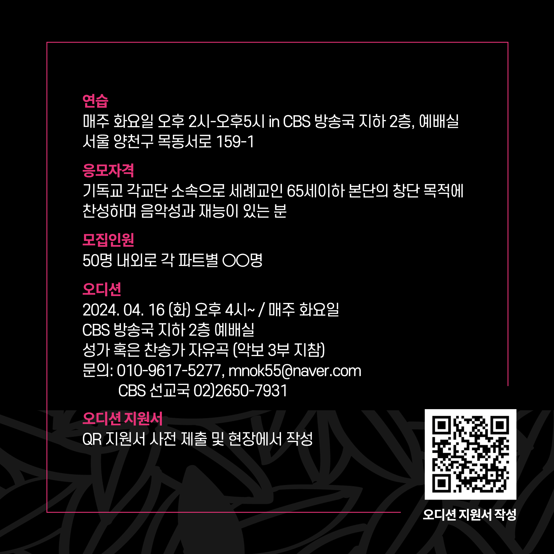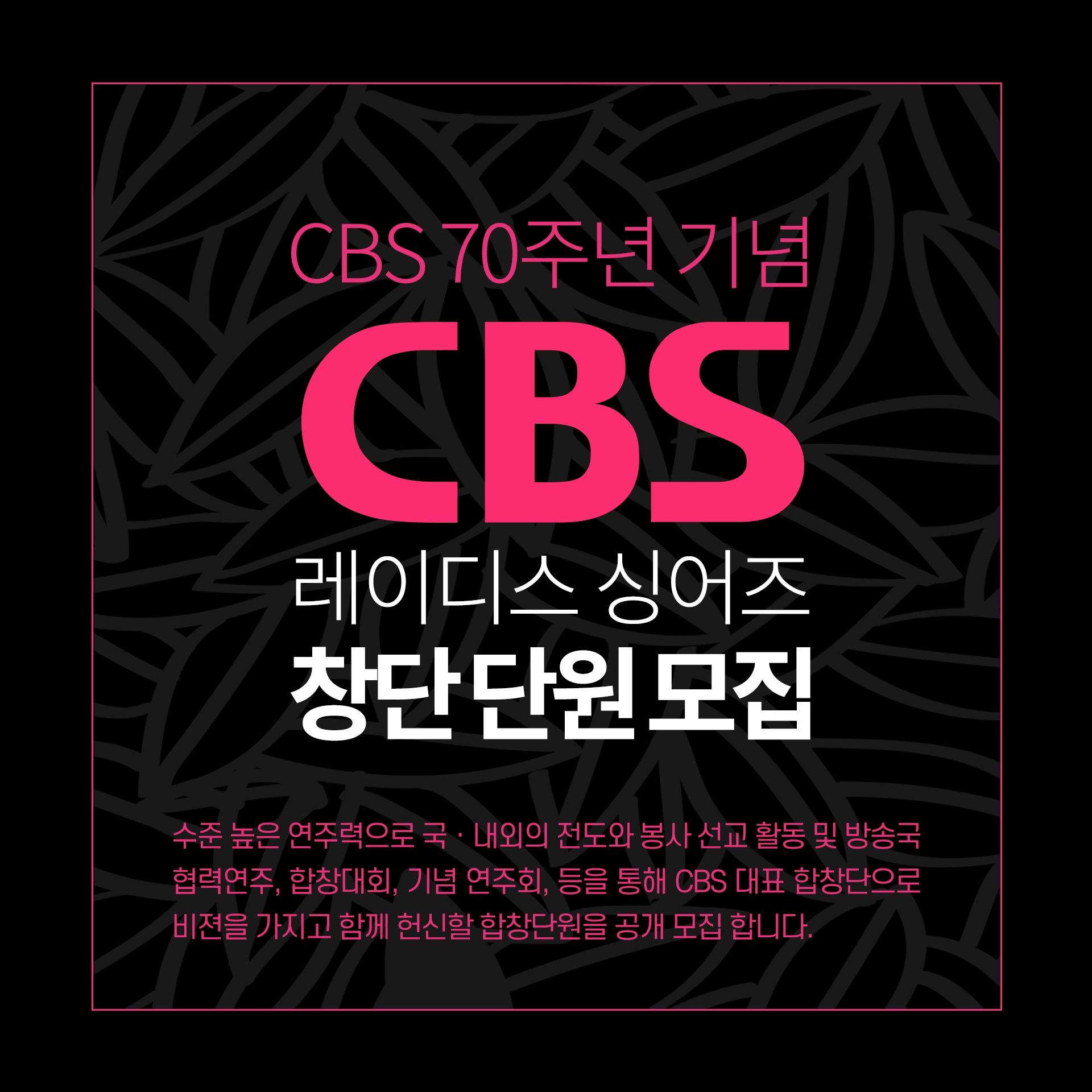 CBS 창사 70주년 기념 에서 CBS 대표 합창단의 비전을 가지고 국내외 전도와 봉사·선교 및 방송국 협력 연주, 합창대회, 연주회 등을 통해 헌신할 합창단원을 공개 모집합니다.